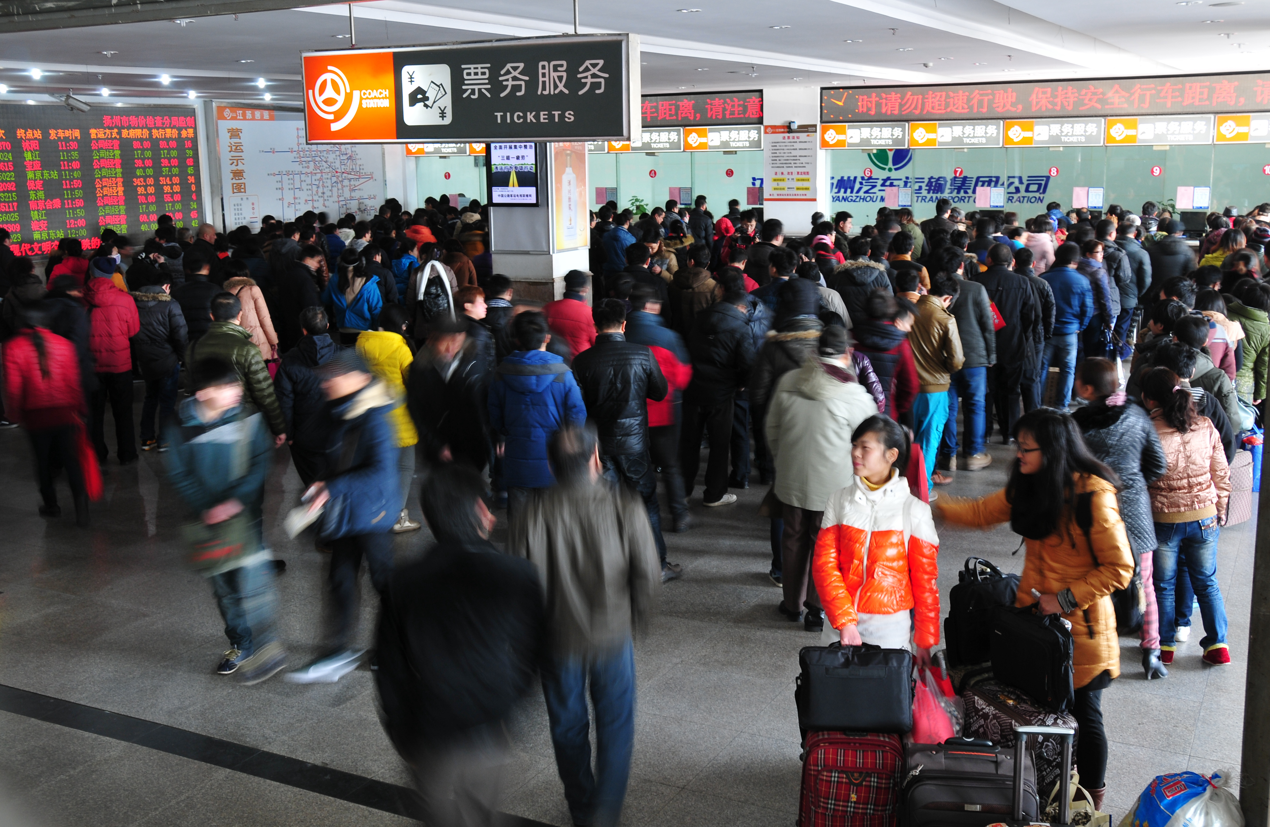 為應(yīng)對旅客購票高峰壓力,揚州汽車站打開了10個售票窗口,汽車東站打開了7個售票窗口,另外還使用了自助售票機、配備了退票專窗、手機換取票專窗。為方便民工返鄉(xiāng),車站還主動聯(lián)系揚州晚報推出“民工返鄉(xiāng)直通車”,集中為市區(qū)周邊廠礦工地的民工兄弟團(tuán)體預(yù)訂了近萬張汽車票。