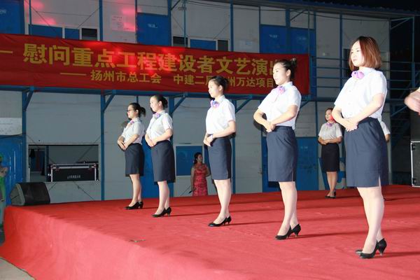 5月3日晚,由揚(yáng)州市總工會(huì)主辦、揚(yáng)州市建設(shè)產(chǎn)業(yè)工會(huì)承辦的“建設(shè)者之歌”——慰問(wèn)重點(diǎn)工程建設(shè)者文藝演出,在揚(yáng)州萬(wàn)達(dá)廣場(chǎng)項(xiàng)目部生活區(qū)隆重舉行。我公司參演的《七彩揚(yáng)汽——員工行為規(guī)范操》得到了在場(chǎng)領(lǐng)導(dǎo)和工程建設(shè)者的一致好評(píng)。市總工會(huì)副主席洪慧娟,市建設(shè)產(chǎn)業(yè)工會(huì)主任田繼榮,市交通產(chǎn)業(yè)集團(tuán)黨委副書(shū)記、紀(jì)委書(shū)記、工會(huì)主席王寧生等領(lǐng)導(dǎo)出席了晚會(huì)。
