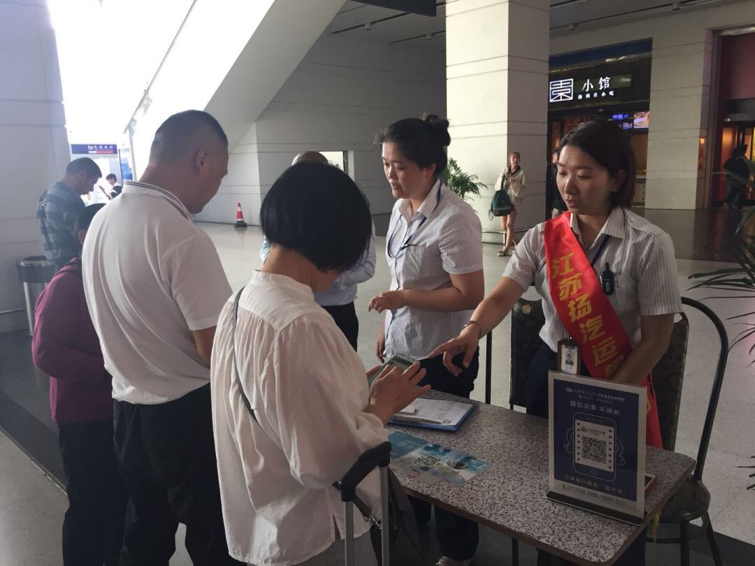 站外,揚(yáng)州站營(yíng)銷小組在火車站下客區(qū)拉起橫幅,身披綬帶開(kāi)展?fàn)I銷活動(dòng),推廣旅游包車業(yè)務(wù)和行包快運(yùn)業(yè)務(wù),免費(fèi)為過(guò)往旅客提供咨詢、兌換零錢(qián)、引導(dǎo)候乘等服務(wù)。讓外地來(lái)?yè)P(yáng)的旅客對(duì)揚(yáng)汽集團(tuán)有了直觀的了解,感受到了我們熱情周到的服務(wù)。