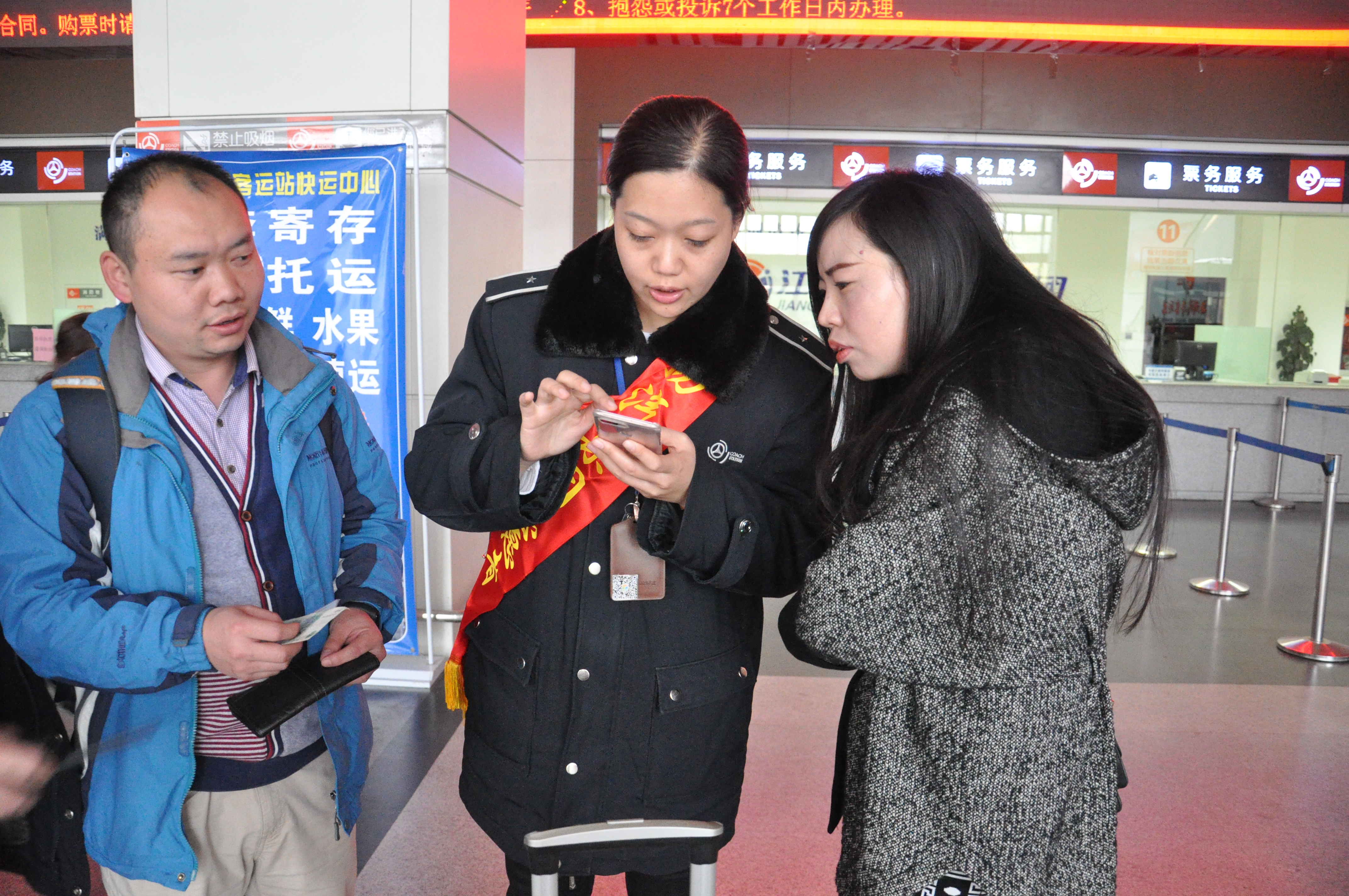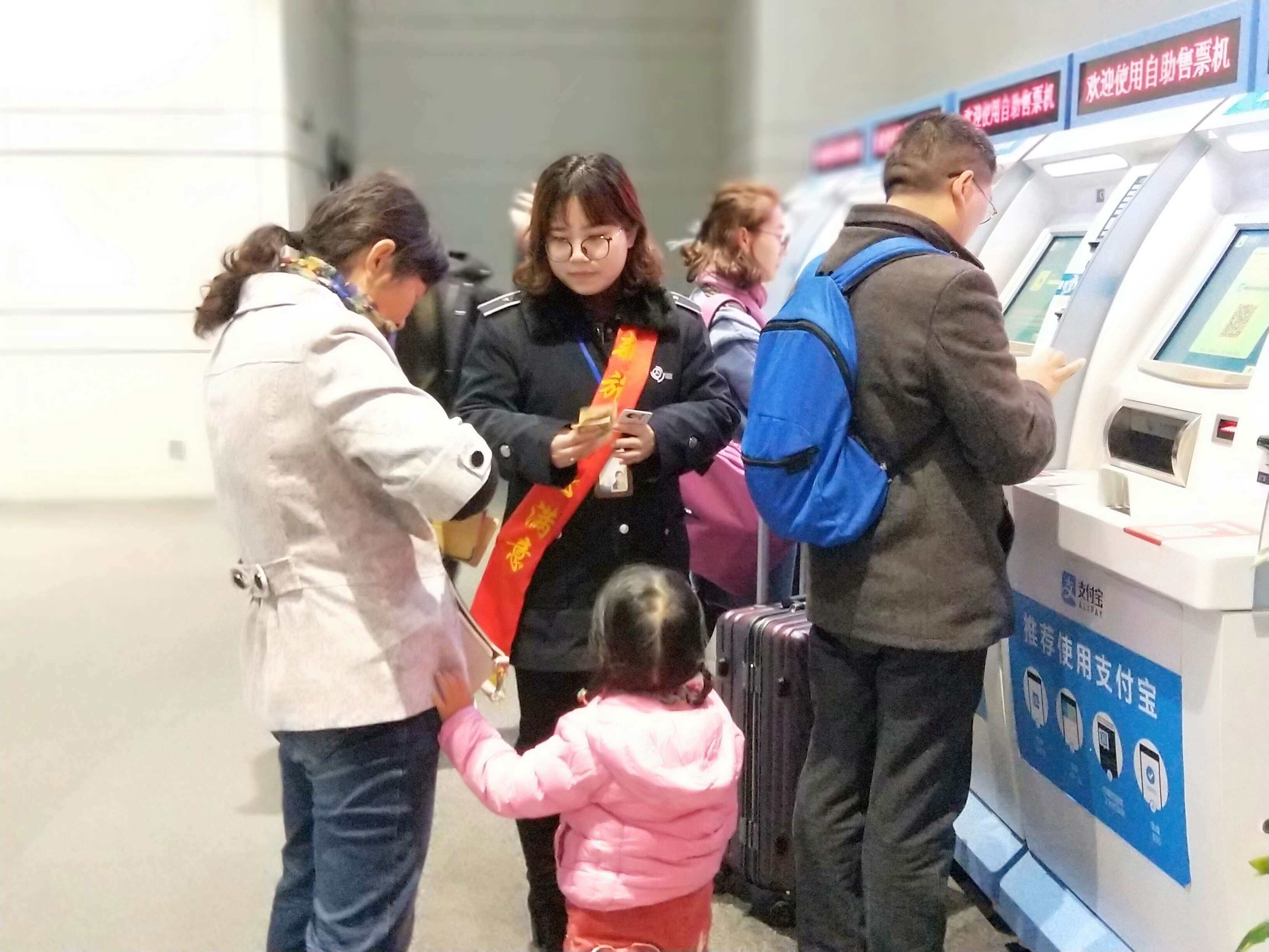在售票大廳里,有一支身披“新旅途 心滿意”綬帶的工作人員隊(duì)伍,正在有條不紊地引導(dǎo)著前來購票的旅客,通過手機(jī)或者自助機(jī)的形式進(jìn)行購票。原來,車站現(xiàn)場按照站長室近期重點(diǎn)工作的部署,主動(dòng)在客流放緩的情況下有序進(jìn)行售票自助化、智能化的嘗試。下午3點(diǎn)現(xiàn)場除退票窗口外,其余窗口臨時(shí)停售,售票員紛紛走出售票窗口,將導(dǎo)乘、購票功能前置。