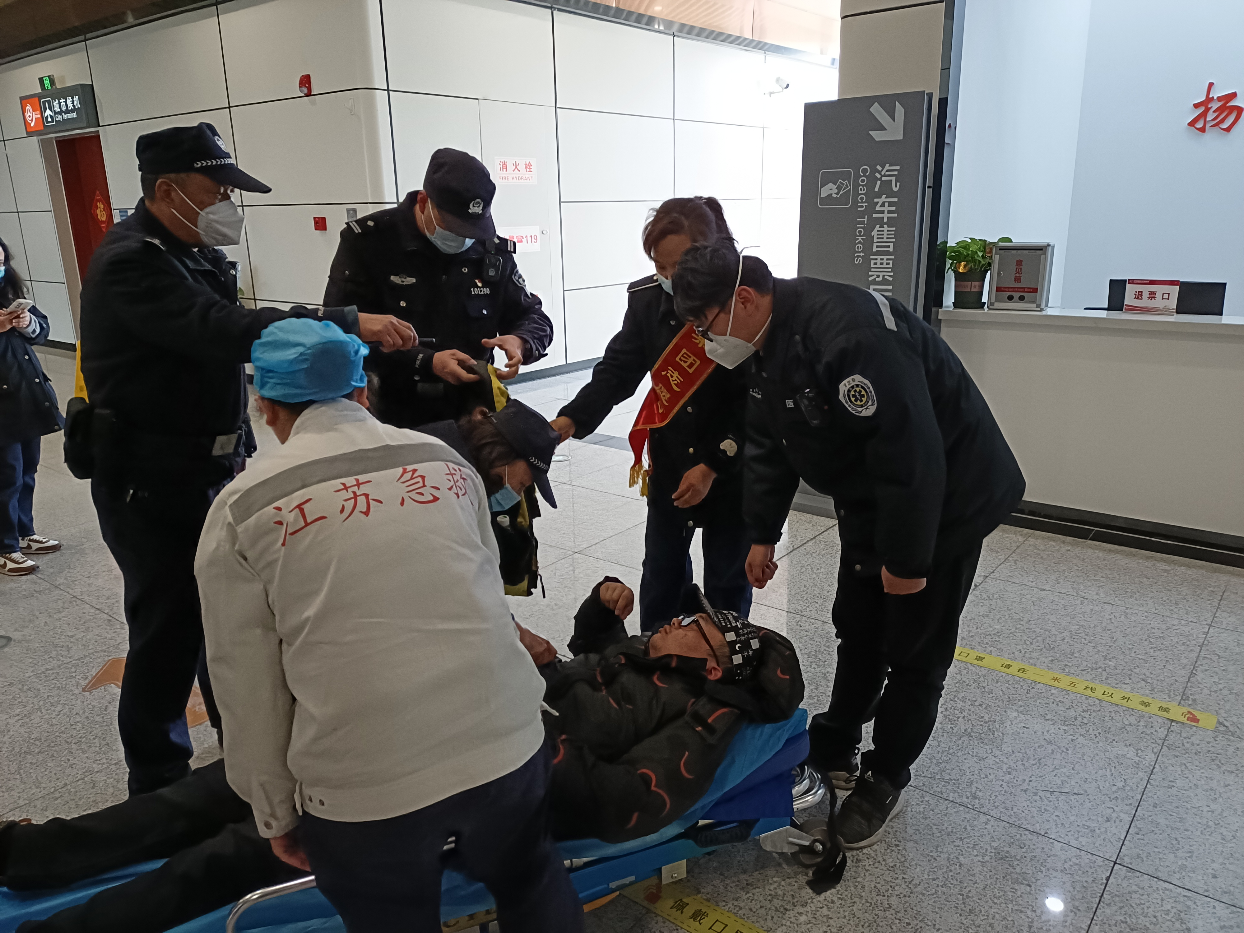 2月16日下午,揚(yáng)州東樞紐汽車站售票處,一名正在購票的旅客突發(fā)癲癇,暈倒在地,現(xiàn)場(chǎng)工作人員及志愿者立即進(jìn)行了救助。