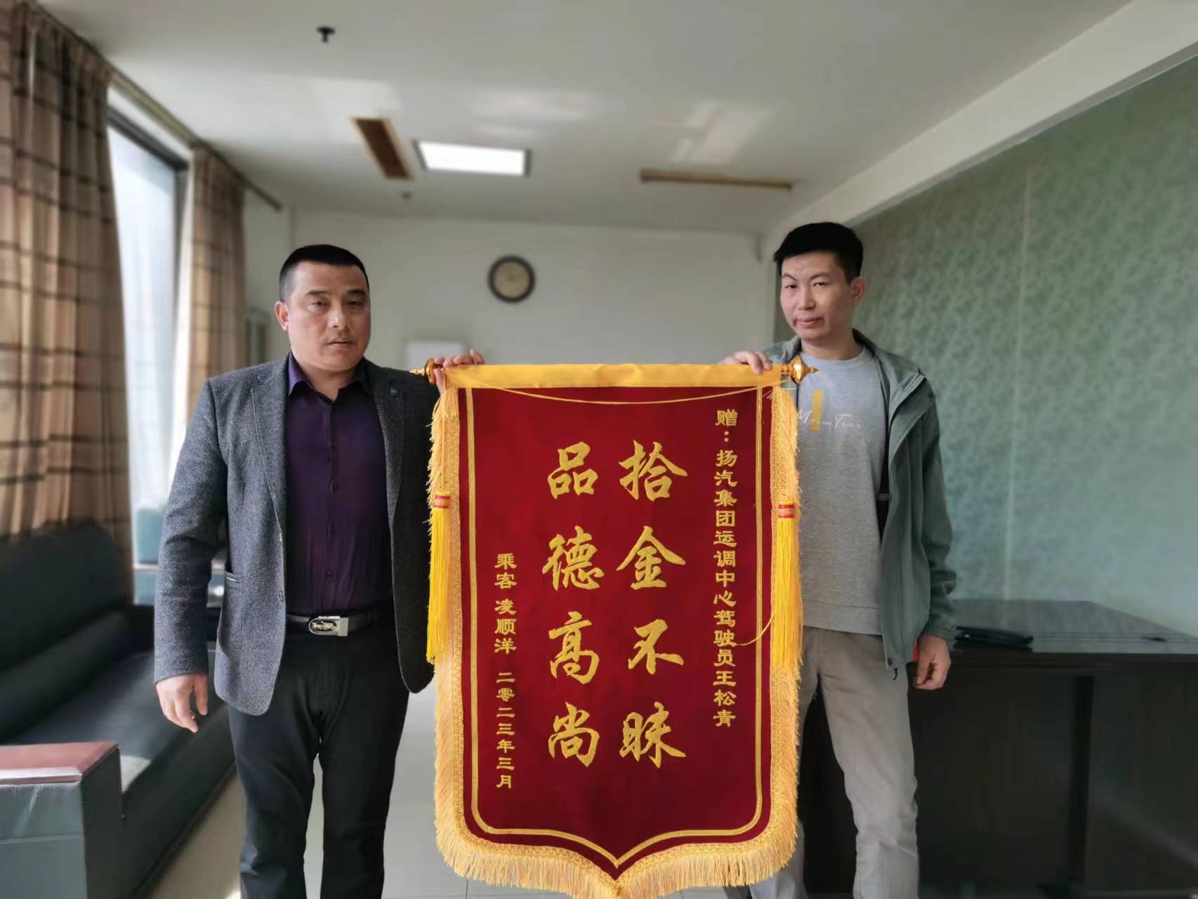 3月31日上午,市民凌先生來到江都汽車站,將一面印有“拾金不昧,品德高尚”的錦旗交到了分公司相關(guān)負(fù)責(zé)人的手上,以此來表達(dá)對(duì)駕駛員王松青師傅拾金不昧行為的感謝。