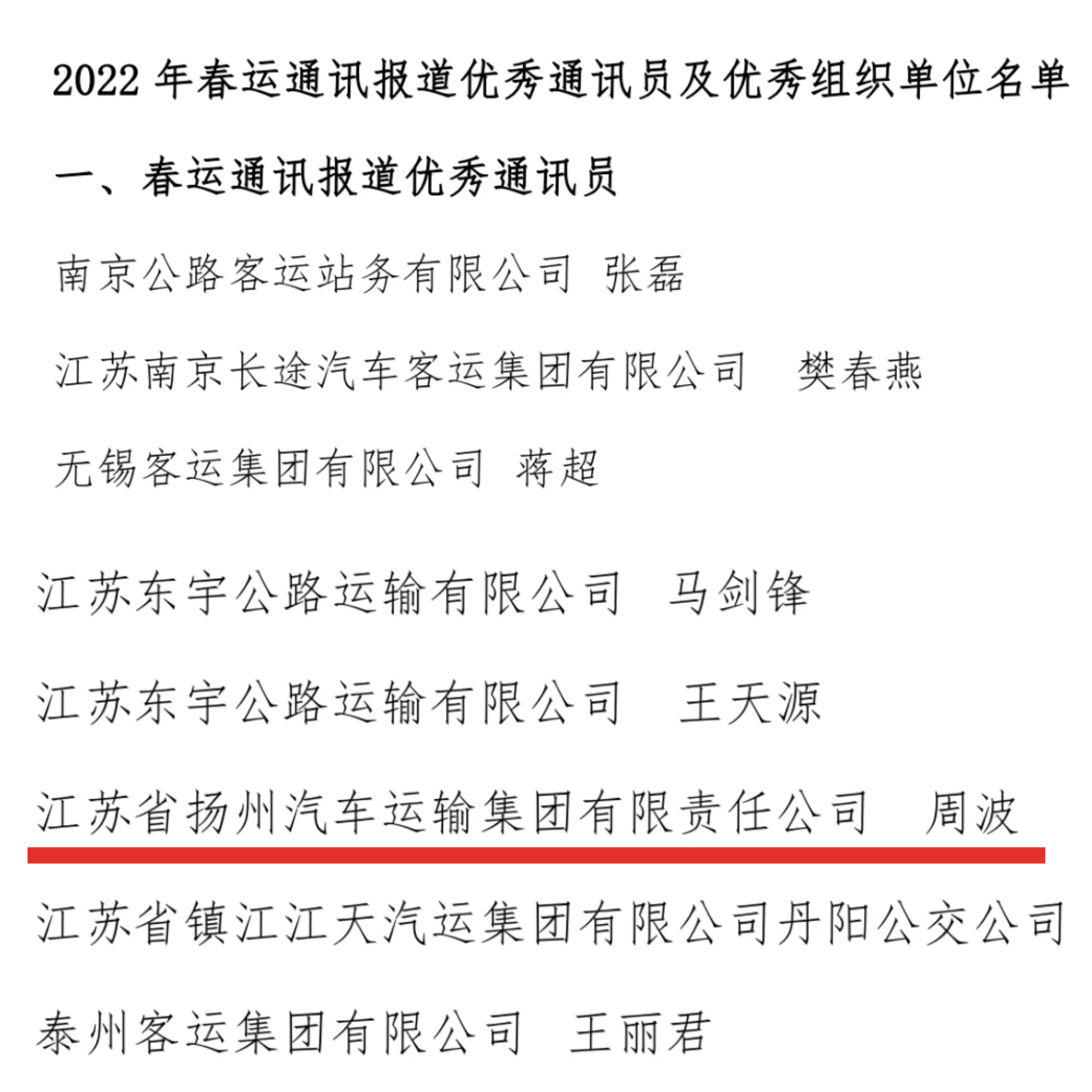 近日,江蘇省交通物流協(xié)會汽車運輸分會下發(fā)《關(guān)于表彰 2022、2023 年春運報道“優(yōu)秀通訊員”、“優(yōu)秀組織獎”的決定》,集團(tuán)周波獲評“2022 年、2023年春運通訊報道優(yōu)秀通訊員”,陳思宇獲評“2023 年春運通訊報道優(yōu)秀通訊員”。