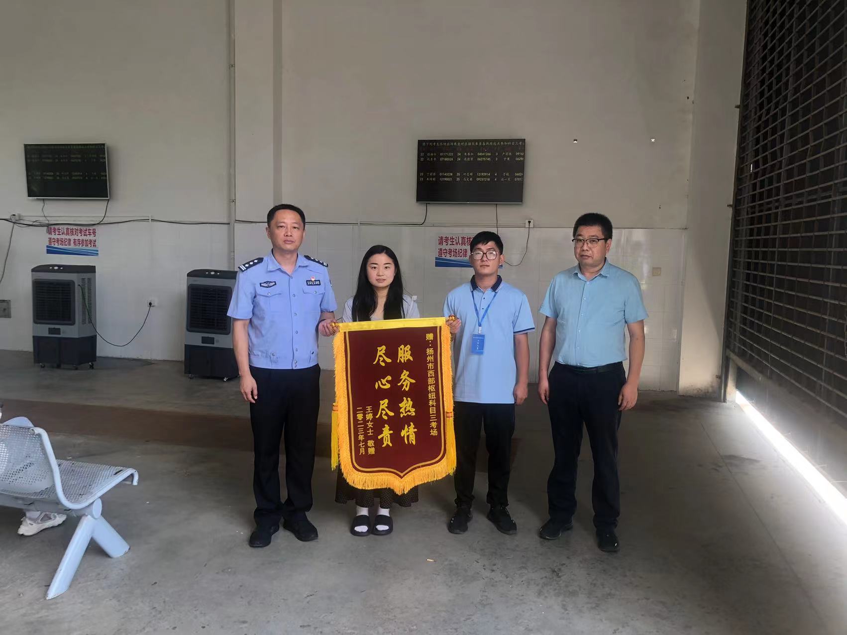 7月27日,揚州西部客運樞紐科目三考場收到了一面錦旗,印有“熱情服務,盡心盡責”,王婷女士將錦旗交至車管所監(jiān)管人員和考場負責人手中,對現場工作人員的幫助表示感謝。