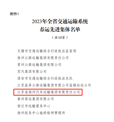 近日,省交通運(yùn)輸廳下發(fā)的《關(guān)于表?yè)P(yáng)2023年全省交通運(yùn)輸系統(tǒng)春運(yùn)先進(jìn)集體和個(gè)人的通報(bào)》,揚(yáng)汽集團(tuán)被授予“2023年全省交通運(yùn)輸系統(tǒng)春運(yùn)先進(jìn)集體”榮譽(yù)稱號(hào)。