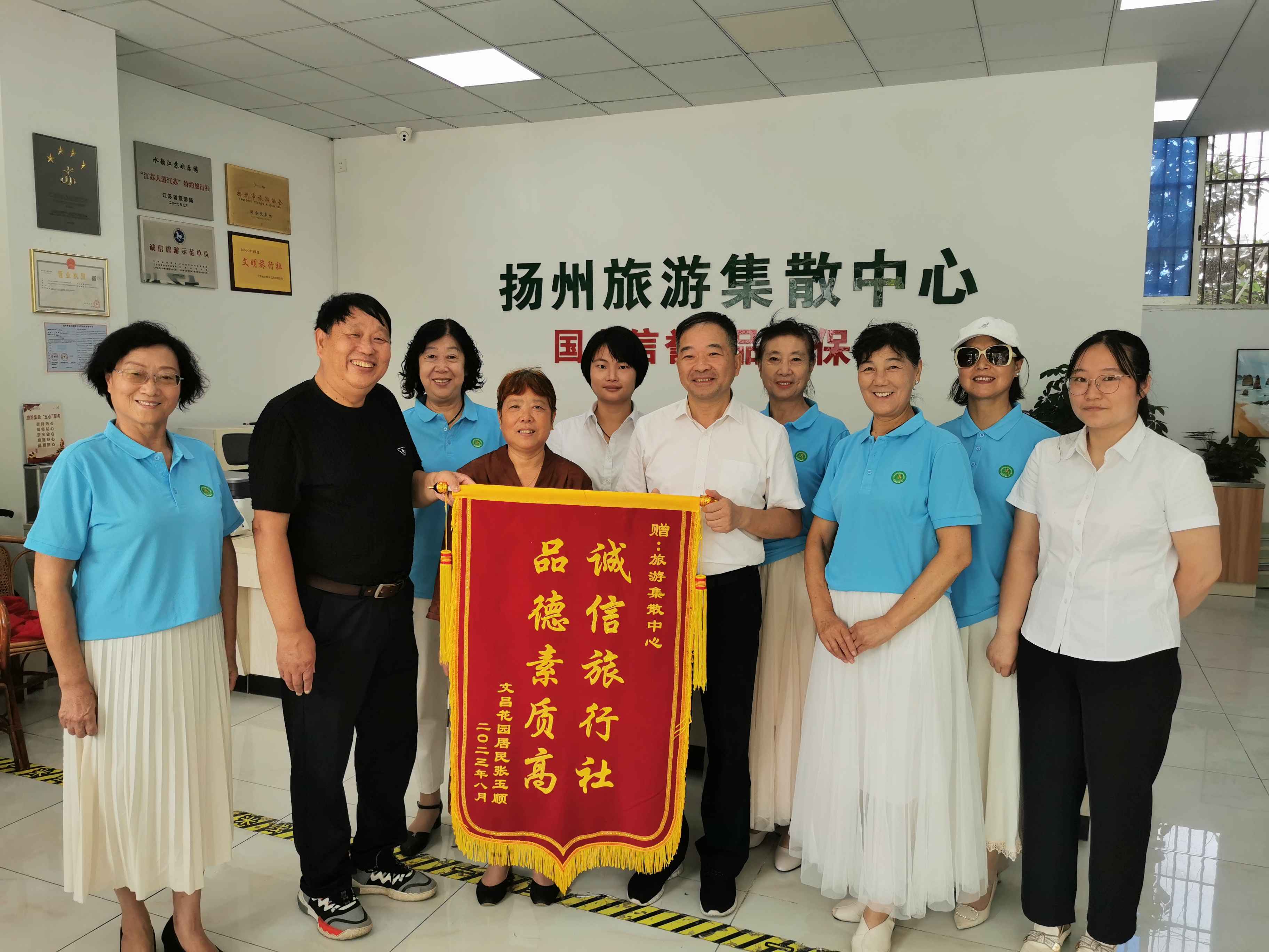 揚州旅游集散中心始終堅信只有真誠細(xì)致的服務(wù),才會讓旅行更有溫度。“誠信旅行社,品德素質(zhì)高”、“真心為民服務(wù)、傾心替民解憂”這兩面紅底金色的錦旗承載著游客對集散中心的認(rèn)可,凝聚著彼此之間真情與感恩,激勵職工不斷提升業(yè)務(wù)能力,時刻為游客解憂,樹公司品牌!