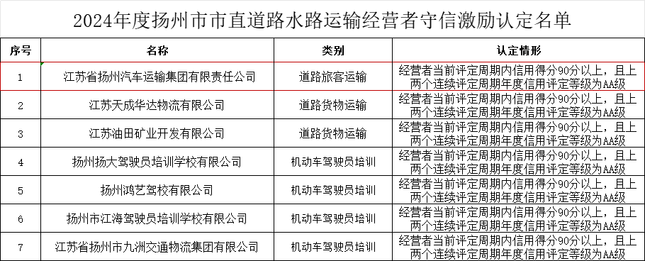 根據(jù)《江蘇省交通運輸行業(yè)信用管理辦法》、《江蘇省道路水路運輸經(jīng)營者信用管理辦法》等文件要求,經(jīng)評審、公示等程序,近日,揚州市交通運輸局發(fā)布認(rèn)定公告,揚汽集團(tuán)獲2024年度揚州市市直道路運輸經(jīng)營者守信激勵名單認(rèn)定。
